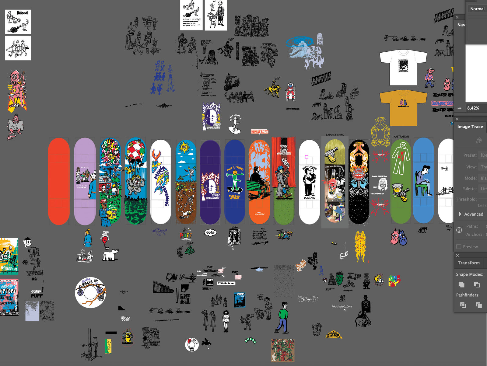 Usually, I'm just doing a bunch of drawings. Simple line drawings that I'm scanning or photographing into the computer. Then I always put them in a big file and try to put things together, like building a little story about what they're doing, and I send it like this, just a big mess in a way. The layout has never been my strong side, really. So, it's been much easier for me to leave that to Pontus. He's good at that. He sends it back to me and I do the final touches of it and make little adjustments. I'd say that is the most common process for us to work on graphics. But sometimes riders would send in inspirational images and come up with wishes too.