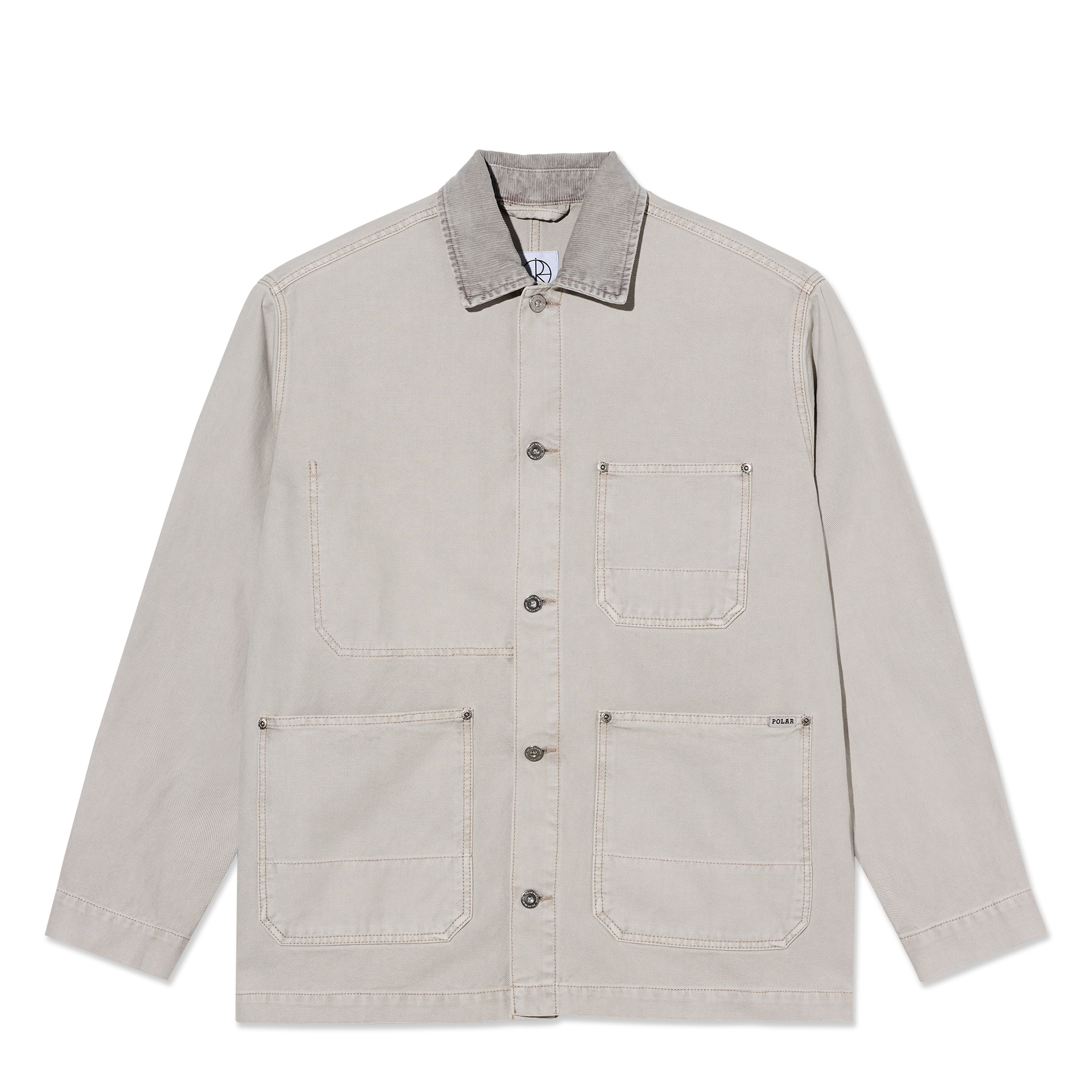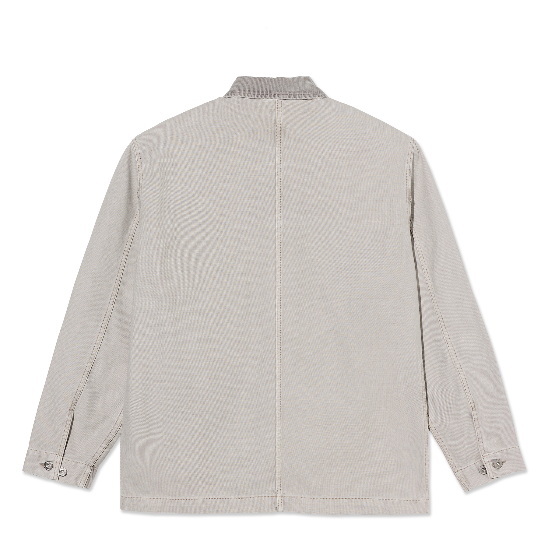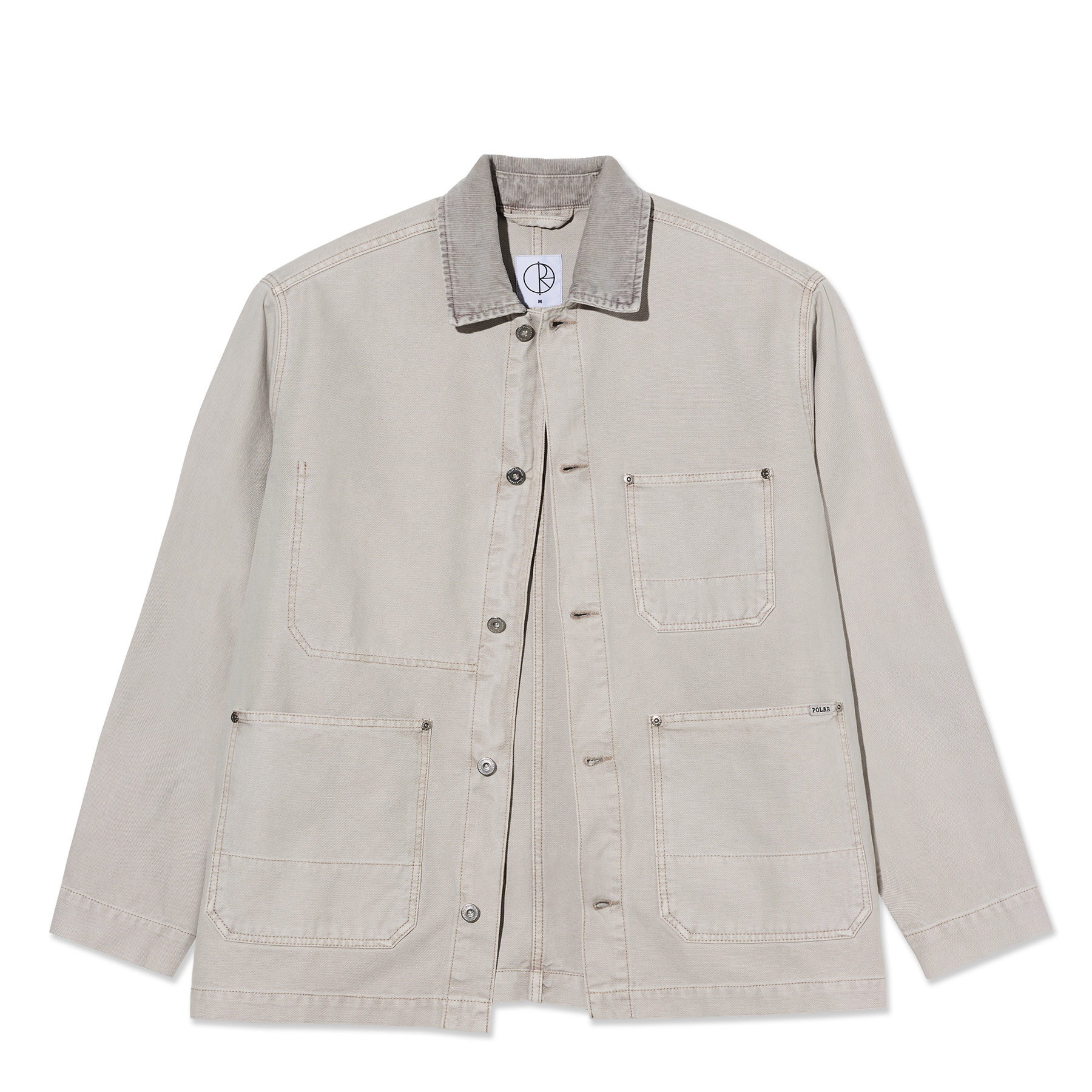 Jacket in pale taupe, crafted from 400 gsm cotton canvas with a stone-washed finish. Point collar in corduroy and a full-buttoned placket with silver metal YKK buttons. Long sleeves with buttoned integrated cuffs and three reinforced outside pockets. Interior chest pocket, woven label, and wide fit silhouette.