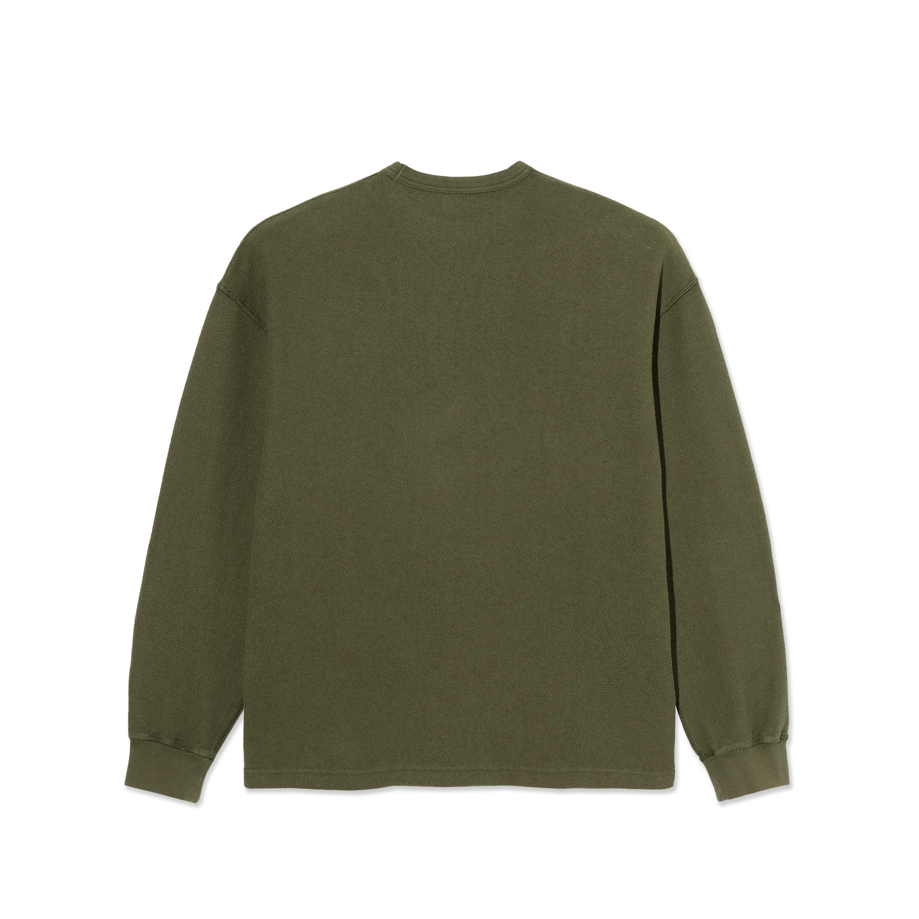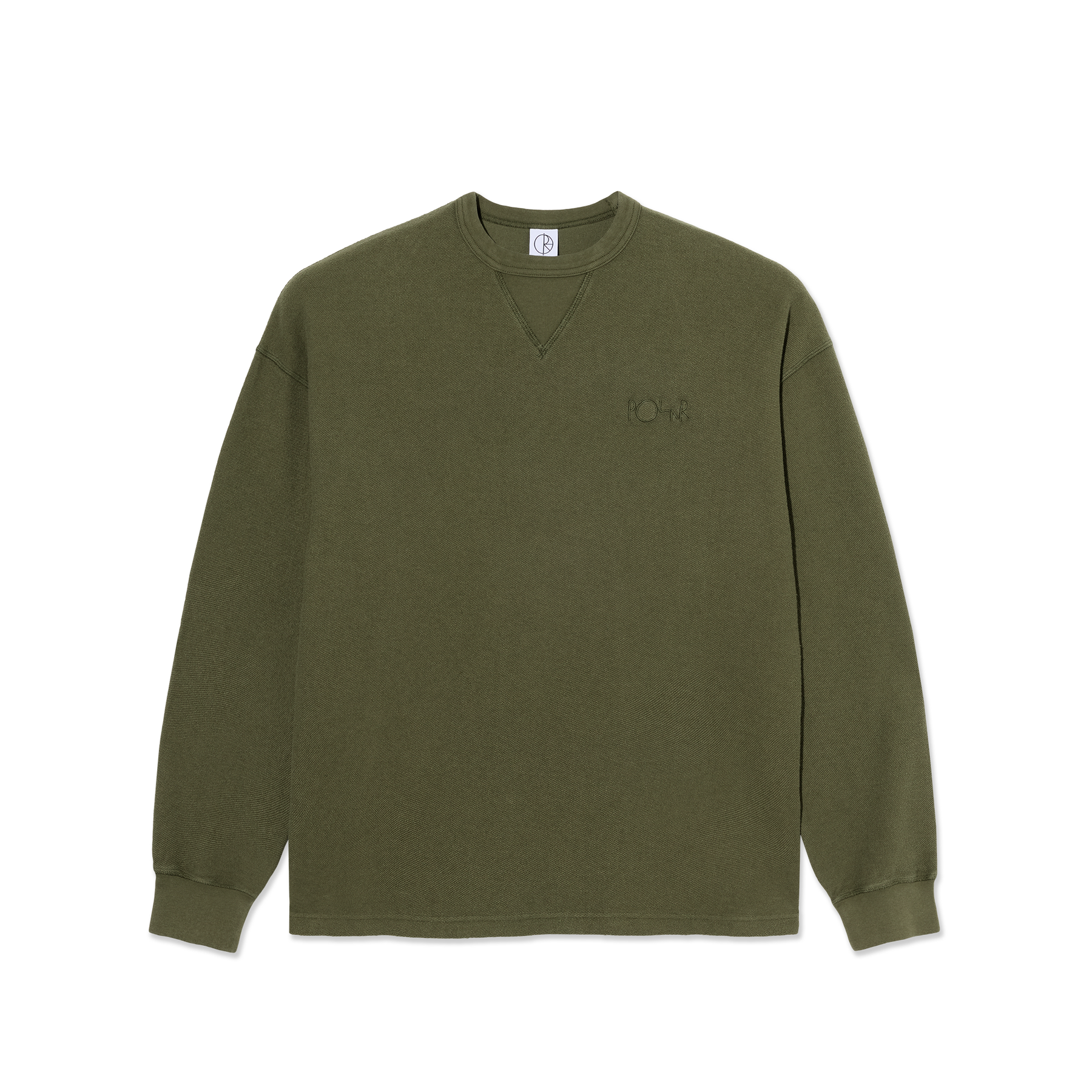 Sweatshirt in army green, crafted from 350 gsm unbrushed loopback jersey with 50% recycled cotton. Stone-washed finish with ripped crew collar and cuffs. Open hem with split sideseam and flatlock stitch detailing. Tonal script logo embroidery, loose cropped fit.